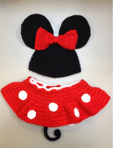 I made one change to the pattern – regarding the spots on Minnie’s skirt. I made them according to the pattern directions once, but they left a huge hole in the center – I’ve never been able to start with a few chain stitches, then crochet in the round without a huge hole, so it could be user error. Instead, I used the Crochet Magic Loop cast on, chained 1, single crocheted 6 into the magic loop, did not join in the round, pulled the loop tight, and finally half-double crocheted 2 in each stitch (12 st). I then joined with a slip stitch & sewed onto the skirt with the long tail. This eliminated the gap in the center of the spot & resulted in a spot very close to the size the pattern called for.