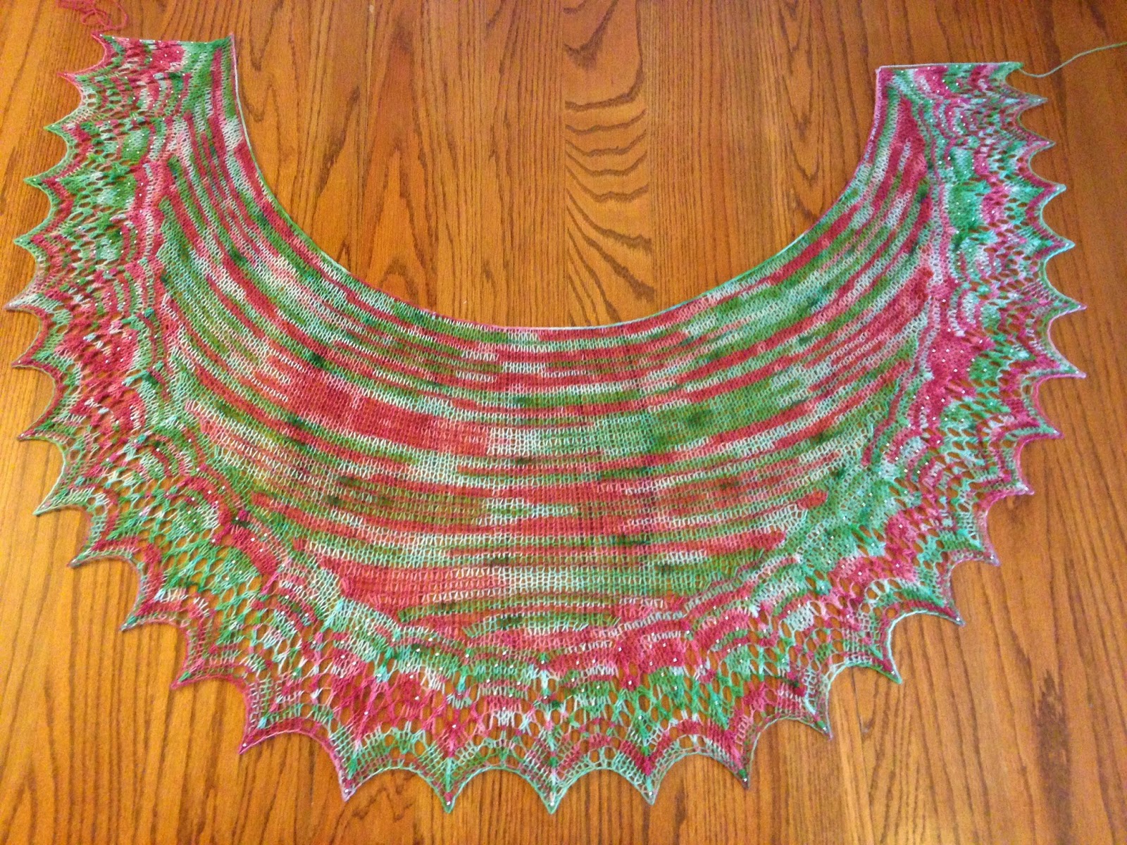 I bought this yarn & beads to match nearly a year ago. Finally, I made it happen. There was a small tragedy on this knit, however; I swatched with two needle sizes, decided on the smaller size based on the blocked fabric, and then somehow managed to cast on with the larger needle! This used more yardage and I ran out of yarn 2 rows before the end of the chart. I was nearly finished with the shawl when I discovered my needle size error and wasn’t willing to rip out all that knitting… or all those beads (almost 1000)! I am happy with the colors & the pattern and I don’t think anyone (except Romi, of course) would know the difference.