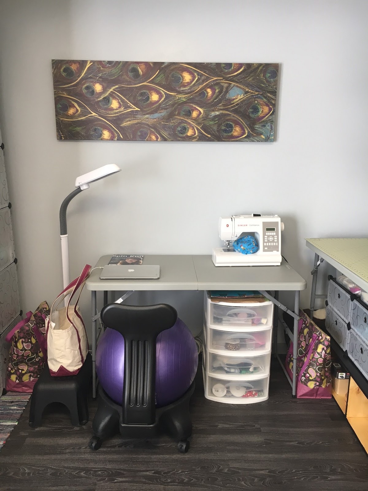 Updates include: new LED light fixture with a daylight bulb, new sliding door, new flooring, new trim, new paint, new outlets & switches, new vent covers, new cubby system and a custom shelf made by my dad (nestled under the cutting table). I found a neat painting that goes with the new wall colors at Home Goods for cheap & dug out these shadowbox shelves from moving boxes that hadn’t been opened in many years. I’m still looking for a good spinning chair, but other than that, this corner is complete!