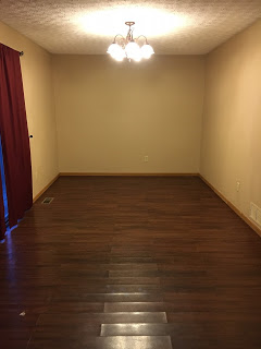This ‘dining room’ was fraught with issues. WAY too much light (when the sliding door curtains were open, still squinting at curtains over a sliding door… it’s just fussy) and then WAY too dark in the corners. The ‘cherry hardwood’ floor was peeling up… good try, realtor dude… the light wasn’t in a good place for a table because lots of dead space in the corners, but then shadows if you moved the table away from the light…