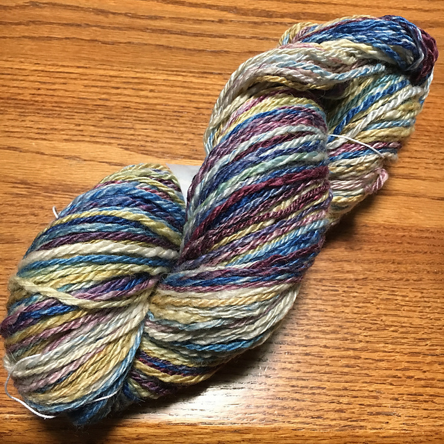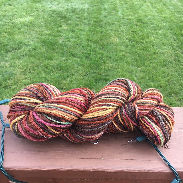 I took a lovely braid of Fiber Optic to the 80th Anniversary Guild spin in and came home with a lovely bobbin of singles, that were chain-plyed the next day on my mini-spinner.