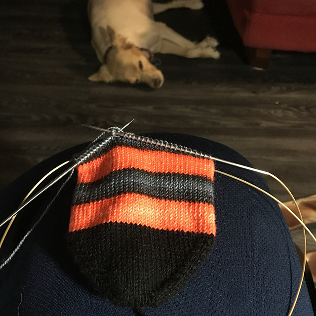 Q2 kicked my butt – I’m not even gonna try to be nice about it. It was rough. I was so ready for it to be over, it’s not even funny. There were a couple serious medical things that happened, some blind-sided financial crap that came up and to top it all off, we had to put my sweet Ellie dog to sleep (I’m sure there will be eventually a post about that when I can manage to type about it without sobbing, but today is not that day). In the meantime, here is the last pic I have of my knitting where she photobombed.