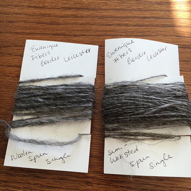 In the meantime, I took a class with the lovely Kate Larson, who has her own flock of Border Leicester sheep. At the end of the second class, she had time for people to ask questions about anything wool related, so I asked her what her MO was for spinning BL. She told me that likely the fuzziness I got was partially from the thickness of the singles and she prefers to spin fine singles and then ply up to the finished weight she wants for the yarn (i.e. – instead of 3 thicker singles like I had tried, try fine singles & use 5 or 6 to create a plyed yarn of the same thickness).