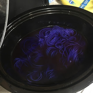 After I prepped the yarn, I put it in the dye bath (water and citric acid) to soak and really get saturated. Meanwhile, I chose some colors to play with: Royal Blue, Teal, Violet, Burgundy and Pink.