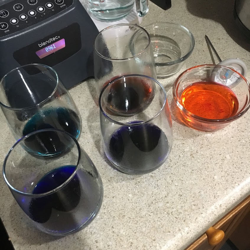 I reconsidered using food dyes instead of Kool-aid. They are also edible and generally safe to handle. They are also easily obtainable and probably have more color combinations available (as you can create your own with a drop of this or that). I already had citric acid in the cupboard, so that wasn’t a hurdle and it’s pretty easy to handle safely as well.