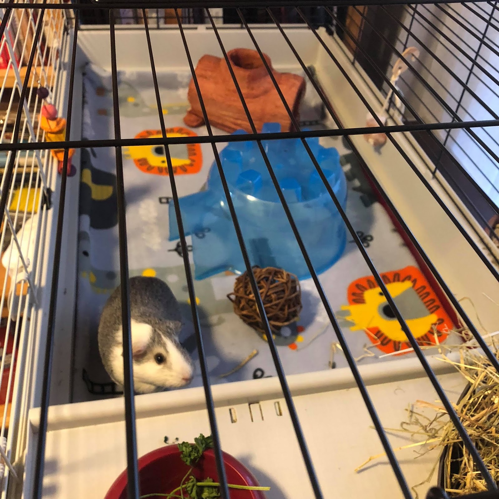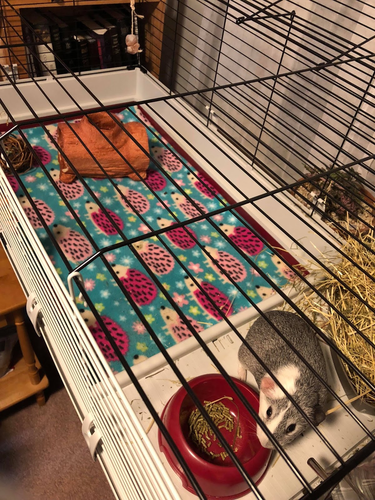 On total cage cleaning days, I remove the pigloo and toys, sweep up solid waste, pull out the lining and take it outside to brush the hay bits and guinea pig hair off. Next, it goes in the washer on hot! While it’s washing, I spray down all the hard surfaces with the vinegar solution and wipe out. Then reassemble the cage as above.
