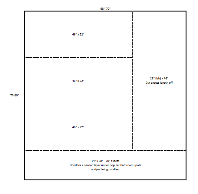 The bottom tray for our cage is 45″ x 21″. (Be sure to measure the dimensions INSIDE the cage, not just go with the dimensions on the box – those are exterior and you will end up with inaccurate cuts.) I decided to cut with 1″ extra fabric on both dimensions to account for future shrinkage. With a little planning, I was able to get 4 tray liners out of one furniture pad, with some left over fabric for other projects. Here is the cut chart we followed, cutting on the dotted lines.