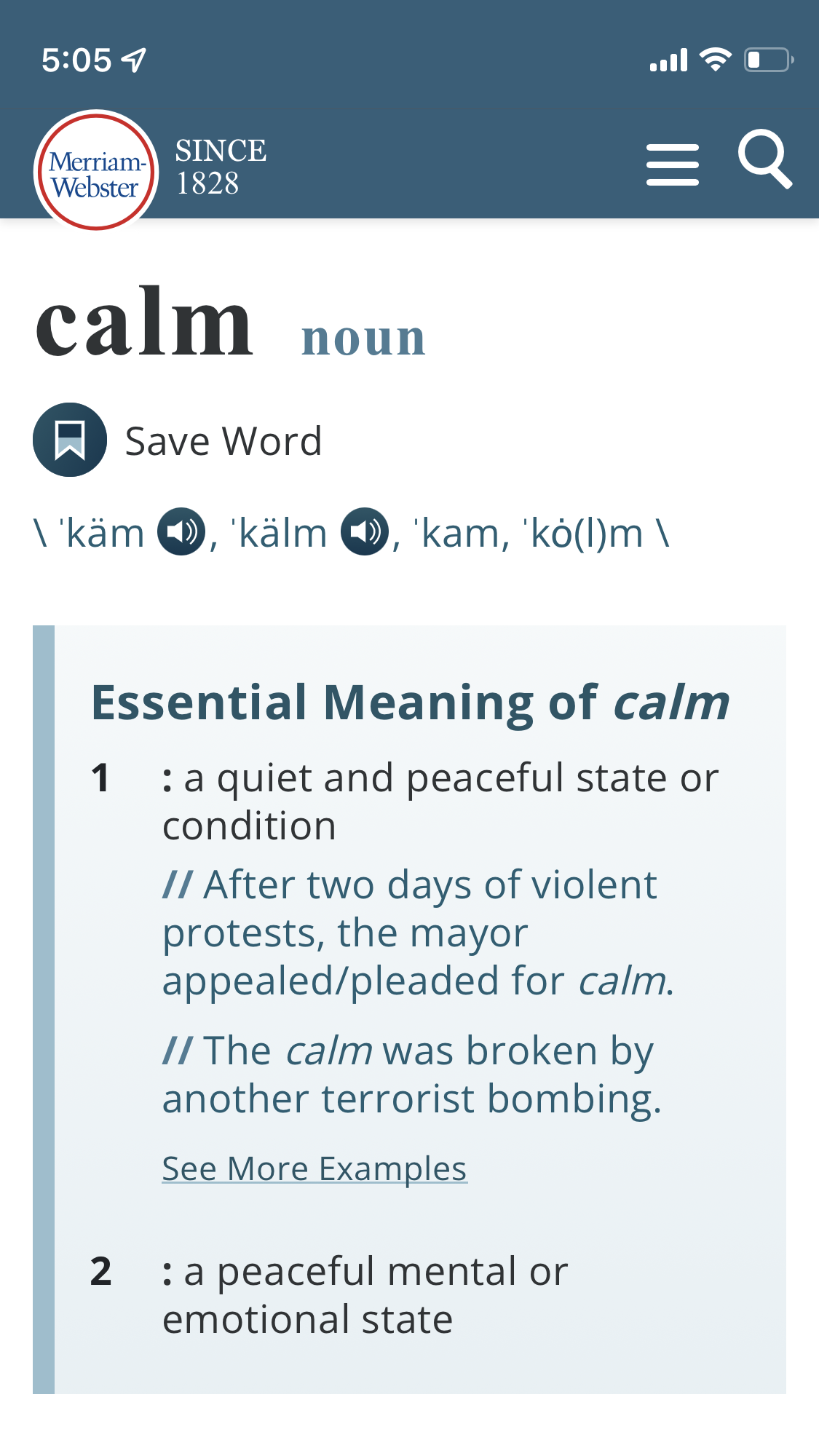 1.a.: a period or condition of freedom from storms, high winds, or rough activity of water
